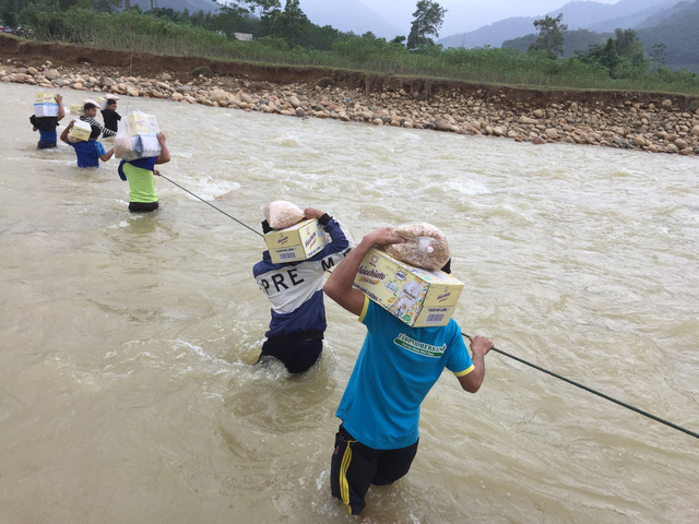 Con đường từ xã Hướng Hiệp vào bản Đá Ngồi bị nước lũ cuốn phăng chiếc cầu nên người dân phải căng dây hai bên đầu sông rồi băng suối sang bên kia nhận hàng cứu trợ.