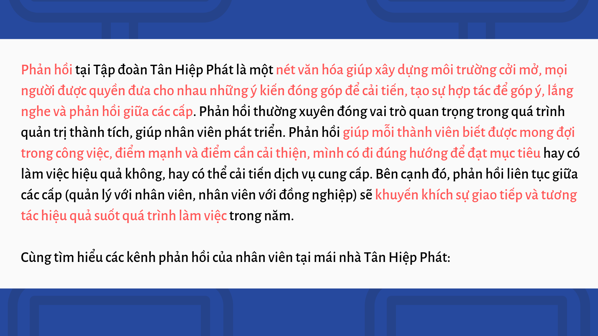 Nhân viên Tân Hiệp Phát phản hồi như thế nào? 30-12-2018 Admin 0 Bình luận0 Lê Châu/ Tin THP NGUỒN: Theo Bản tin nội bộ Tân Hiệp Phát Link bài: Nhân viên Tân Hiệp Phát… (https://www.thp.com.vn/nhan-vien-tan-hiep-phat-phan-hoi-nhu-the-nao) Rate this post