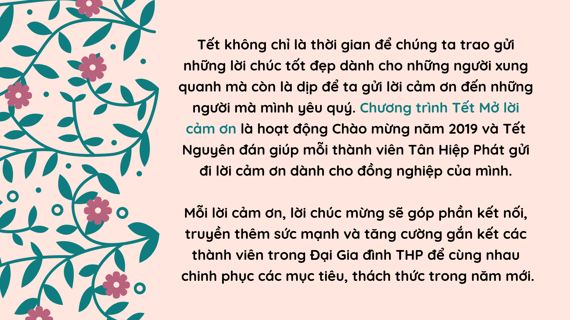 Năm nào cũng vậy, THP đều có các hoạt động gắn kết nhân viên với nhau, ngoài chương trình “Chia sẻ yêu thương” để mọi người góp tay phụ giúp mấy em công nhân còn khó khăn, chương trình “Tết mở lời cảm ơn” để khuyến khích nhân viên biết tri ân những đồng nghiệp đã cùng mình làm việc suốt một năm. Tất cả nhằm tăng cường sự đoàn kết, chung sức chung lòng của các thành viên trong Đại gia đình Tân Hiệp Phát.