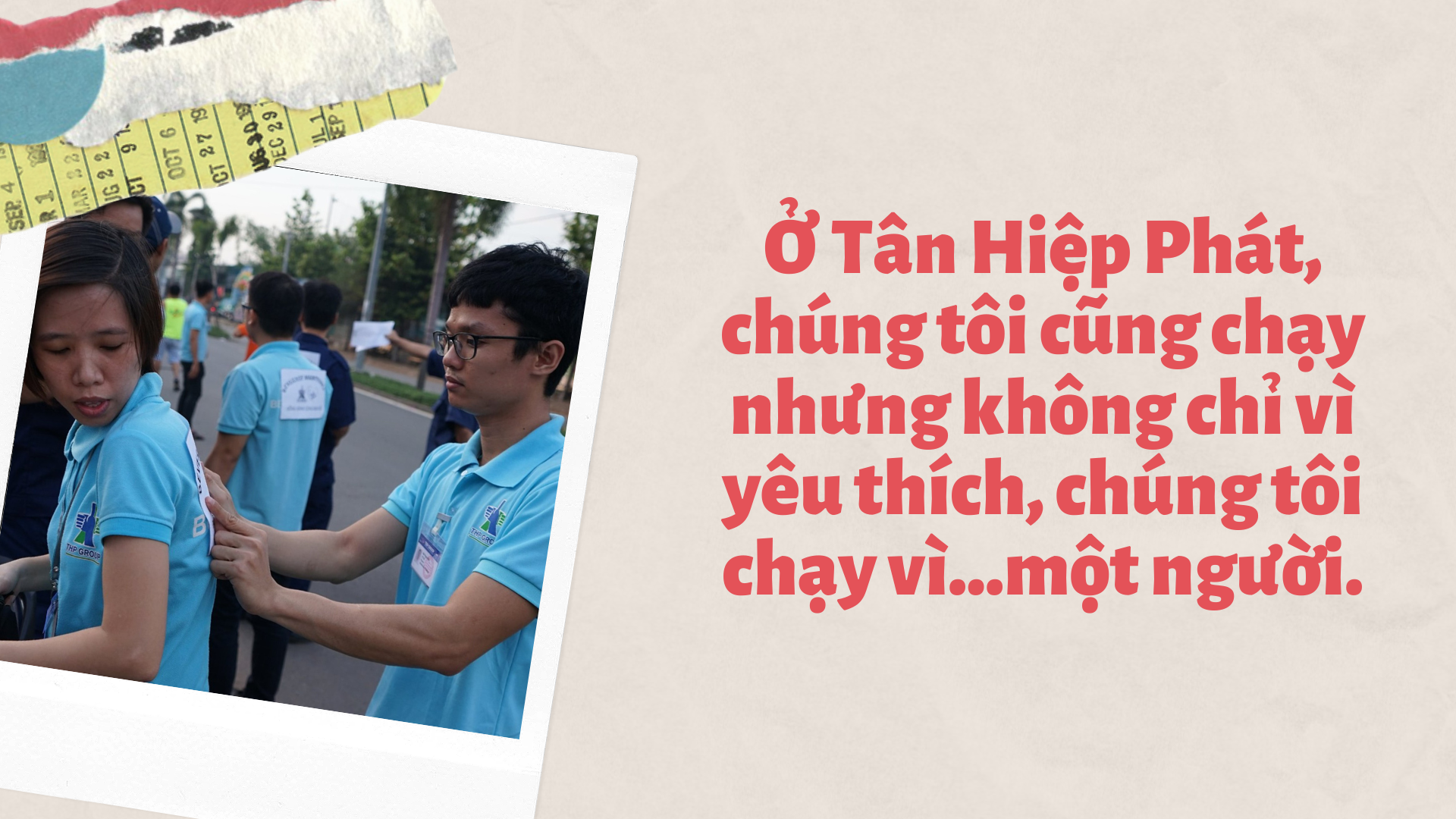 Có rất nhiều lý do để tổ chức một giải chạy bộ, đó là vì muốn cổ vũ, khuyến khích sự yêu thích bộ môn này hay cũng có thể là vì mục đích cộng đồng, mục đích tôn vinh,…Ở Tân Hiệp Phát, chúng tôi cũng chạy nhưng không chỉ vì yêu thích, chúng tôi chạy vì…một người.